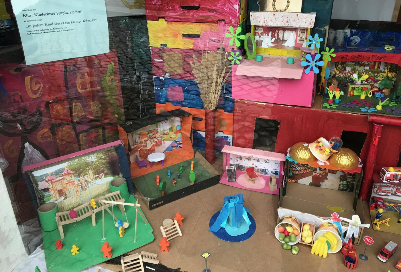 Momentan können Sie im Schaufenster eines Gebäudes am Markt eine schöne Ausstellung der Kita "Kinderinsel Teupitz am See" bewundern. Weiter unten finden Sie ein paar Fotos davon.