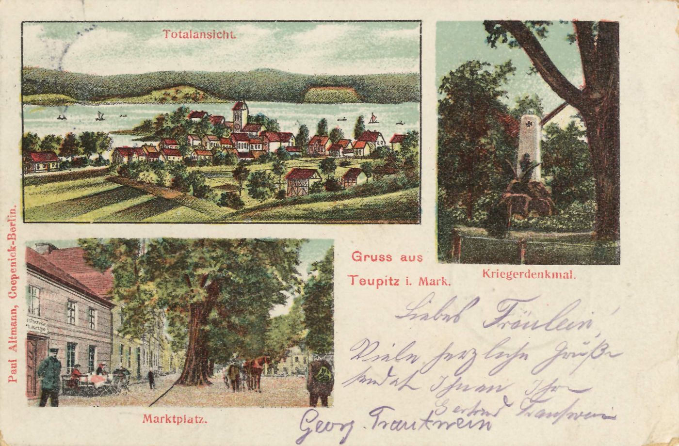 Das denkmalgeschützte Kaiser Wilhelm- und Kriegerdenkmal befindet sich auf dem Marktplatz im Zentrum der Stadt an der Straßenkreuzung Markt/Poststraße. Anlässlich des 25. Jubiläums des "Vereins ehemaliger Waffengefährten von Teupitz und Umgebung" stellten Handwerker im Jahr 1904 das Kunstwerk des deutschen Bildhauers Arnold Künne auf. Es bestand aus einer Kaiserkrone, einem Eisernen Kreuz, einem Relief des Kaisers aus Bronze sowie einem rund 150 kg schweren preußischen Adler.